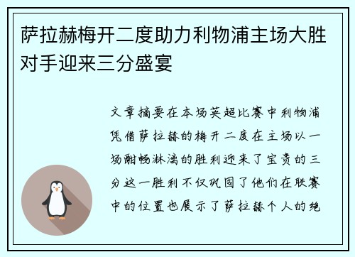 文章摘要:在本场英超比赛中,利物浦凭借萨拉赫的梅开二度,在主场以一场酣畅淋漓的胜利迎来了宝贵的三分。这一胜利不仅巩固了他们在联赛中的位置,也展示了萨拉赫个人的绝佳状态。萨拉赫的两个进球,不仅展现了他在锋线的强大威胁,更加突显了利物浦整体攻防...